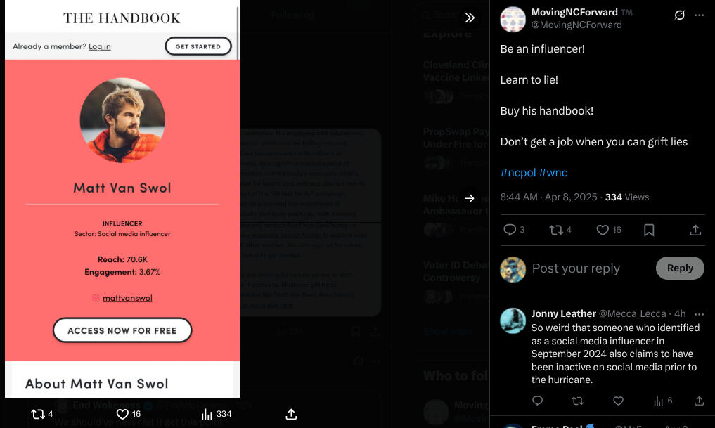 The NC Flood Relief Fund IncidentMatt Van Swol raised almost half a million dollars for NC flood relief following a hurricane in North Carolina, a state prone to such events. There is no evidence that it was distributed to victims or victim relief.Given Van Swol’s rise as a conservative figure and his North Carolina ties, the funds were raised after Hurricane Helene, which devastated western NC.The funds were ostensibly collected to aid victims with housing, food, and recovery efforts, a common charitable cause post-disaster.Following Hurricane Helene’s landfall, Van Swol, leveraging his growing X presence and conservative audience, launched a GoFundMe and off-platform crowdfunding campaigns, including through a Venmo account.He posted emotional videos on X, showcasing flooded homes in Asheville and Buncombe County, promising 100% of donations would go to victims. His Tesla with the “DOGE” license plate appeared in some footage, tying the campaign to his political persona.Within two weeks, the campaign raised $450,000, fueled by donations from his 50,000+ X followers and mentions by conservative influencers.Lack of TransparencyRed Flags: By mid-November 2024, donors began noticing no updates on fund distribution. Van Swol’s X posts shifted to political rants (e.g., about DOGE cuts) rather than relief efforts.Response: When questioned, he claimed delays due to “bureaucratic hurdles” and promised a detailed report by December 2024. However, no financial statements or recipient lists were provided.Alleged Misuse of Funds (December 2024 – January 2025) for personal expenses, including a down payment on a luxury Tesla Model X (beyond the “DOGE” plate car); a shell company linked to Van Swol’s podcast production and travel expenses.There is no evidence of disbursal to relief organizations like the Red Cross or local NC charities.Van Swol claimed the funds were “invested in long-term recovery projects,” but no projects were named or verified.By February 2025, victims and donors took to X, tagging @MovingNCForward