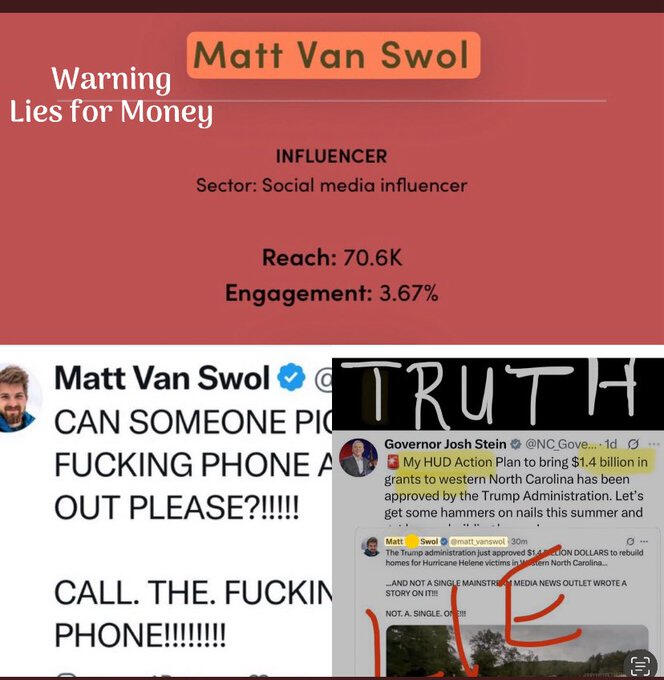 8. The Conservative movement has a documented history of grift, as seen in cases like Steve Bannon’s fraud-plagued border wall fundraiser or the proliferation of “scam PACs” that raised more than $40 million in 2014, spending only $3 million on actual candidates. Van Swol’s rise parallels this trend: a relatively unknown figure gaining prominence by tapping into post-disaster outrage and conservative talking points. His X posts, such as those decrying FEMA or highlighting his “boots-on-the-ground” efforts, have garnered significant attention—potentially translating into followers, influence, or financial opportunities like donations, sponsorships, or speaking gigs.It's only a matter of days before Matt is going to have a podcast and a speaking tour and try to make money on a deeply principled life-saving movement in America. He will come with his soft, liberal ways and wave the MAGA flag to signal his belonging.It is our job, Fellow Conservatives, to protect America from these fly-by-night grifters before they rob Our Country blind and weaken the movement we have spent our lives rebuilding.